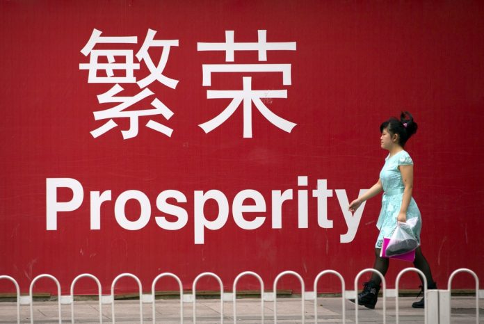 In this July 15, 2015 photo, a woman walks past a sign reading "Prosperity" in Chinese and English in Beijing. China's economic growth decelerated in the latest quarter but relatively robust spending by Chinese consumers helped to avert a deeper downturn. The world's second-largest economy grew by 6.9 percent in the three months ended in September, the slowest since early 2009 in the aftermath of the global crisis, data showed Monday, Oct. 19, 2015. That was down from the previous quarter's 7 percent. (AP Photo/Mark Schiefelbein)
