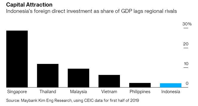 Investasi langsung asing (FDI) ke Indonesia sebagai persentase dari PDB relatif rendah, dan agak stagnan, dibandingkan dengan sejumlah Negara tetangga.