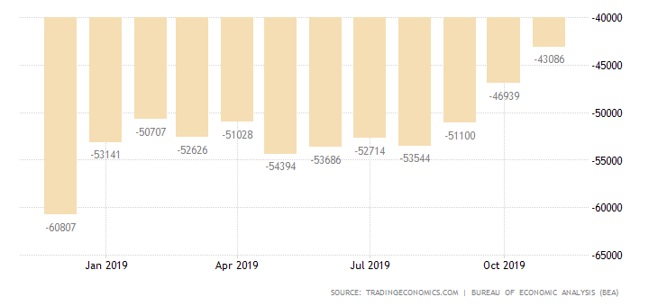Berdasarkan data Badan Statistik Amerika defisit neraca perdagangan AS dengan China pada tahun 2018 sebesar US$ 419,16 miliar dan sepanjang tahun 2019 minus bulan Desember defisit sebesar US$ 320,82 miliar. Turunnya defisit perdagangan dengan China tersebut juga turut menurunkan defisit perdagangan Amerika Serikat. Sejak bulan Januari 2019 hingga November 2019, defisit perdagangan menurun terus, yang terlihat dari grafik dibawah.