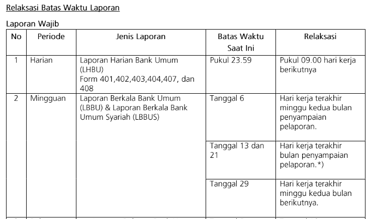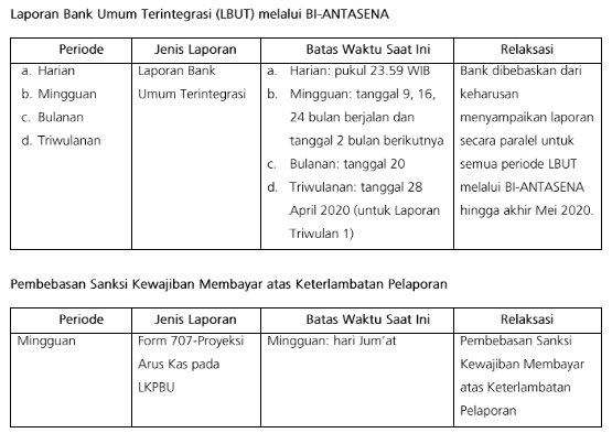 Relaksasi batas waktu pelaporan dan pembebasan sanksi kewajiban membayar atas keterlambatan terhadap pelaporan tertentu sebagaimana (Lampiran) serta penundaan pengenaan SPE, berlaku sejak 31 Maret 2020 hingga batas waktu yang ditetapkan kemudian.