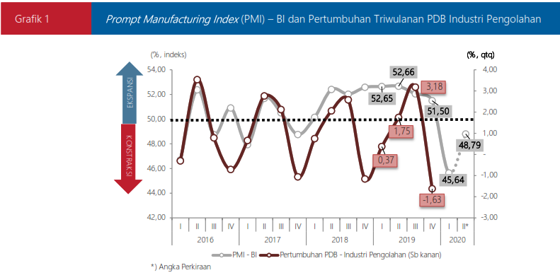 Dari data statistik terlihat, berdasarkan data Prompt Manufacturing Index (PMI) Bank Indonesia terkini, kinerja industri pengolahan diperkirakan menurun cukup tajam pada triwulan I-2020. Penurunan tersebut terindikasi dari PMI-BI periode triwulan I-2020 yang berada pada fase kontraksi dengan indeks sebesar 45,64%, turun dari 51,50% pada triwulan IV-2019. Pada triwulan II-2020, industri pengolahan diprakirakan masih mengalami kontraksi meskipun tidak sedalam triwulan sebelumnya, yang tercermin dari indeks PMI-BI sebesar 48,79%, meningkat dari 45,64% pada triwulan I-2020 (Grafik 1).