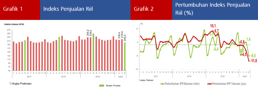 Penjualan eceran pada April 2020 diprakirakan semakin terkontraksi. Hal ini tercermin dari prakiraan pertumbuhan IPR April 2020 sebesar -11,8% (yoy), disebabkan penurunan yang terjadi pada seluruh kelompok komoditas yang disurvei. Penurunan terdalam terjadi pada kelompok Barang Lainnya, khususnya subkelompok Sandang, yang diprakirakan turun -67,3% (yoy), lebih dalam dari -60,5% (yoy) pada Maret 2020.