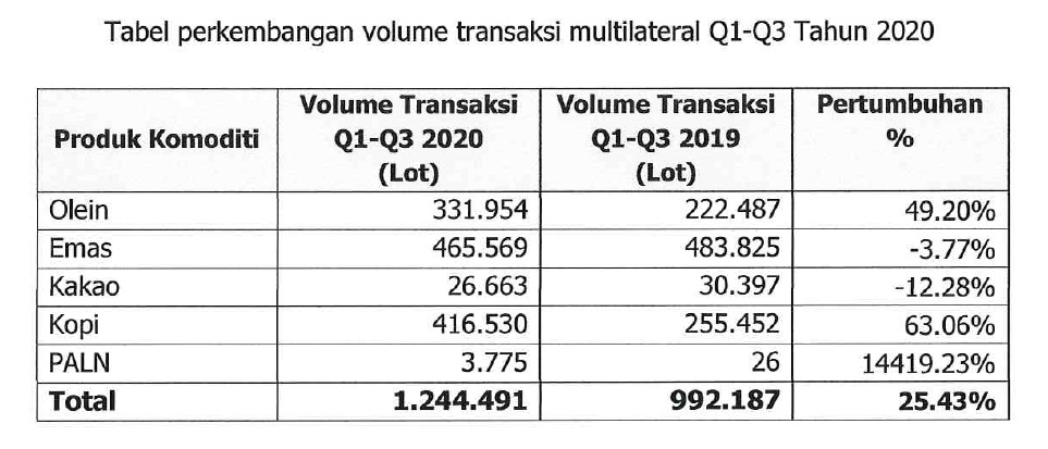 (Vibiznews – Commodity) Transaksi komoditi yang diperdagangkan di Bursa Berjangka Jakarta atau Jakarta Futures Exchange OFX) sepanjang Q-1 s/d Q3 tahun 2020 mengalami lonjakan sebesar 25,43% atau naik 252.304 Lot menjadi 1244.491 Lot, dibanding periode yang sama di tahun 2019 yang sebesar 992.187 Lot. Transaksi kontrak komoditi atau yang lebih dikenal dengan transaksi multilateral ini diperkirakan akan terus meningkat sepanjang tahun 2020.