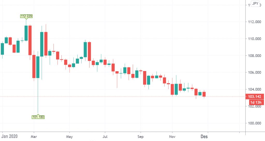 Pada tahun pandemi ini, perdagangan aset risiko ambruk di kuartal pertama tahun 2020, kemudian beranjak pulih dan cetak rekor tertinggi masuki kuartal kedua hingga akhir tahun. Namun pada periode yang sama posisi pair USDJPY menunjukkan pergerakan turun dari kuartal kedua hingga akhir tahun ini. Posisi pair secara tahunan anjlok 5,4% tahun ini hingga turun ke posisi terendah sejak April 2016 pada perdagangan awal bulan Maret 2020.