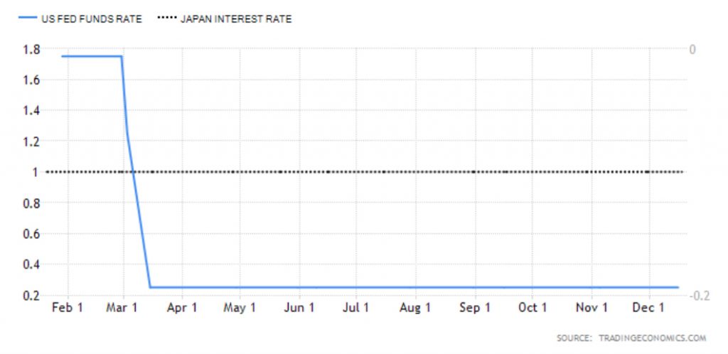 Federal Reserve menurunkan suku bunga sebanyak 2 kali pada bulan Maret, pertama menurunkan sebesar 50bps menjadi 1-1,25 persen kemudian 2 pekan kemudian diturunkan sebesar 100bps menjadi 0-0,25 persen dan meluncurkan program pelonggaran kuantitatif sebesar $ 700 miliar untuk melindungi ekonomi AS dari efek virus corona. Kemudian Federal Reserve meluncurkan paket stimulus baru pada bulan April hingga $ 2,3 triliun.