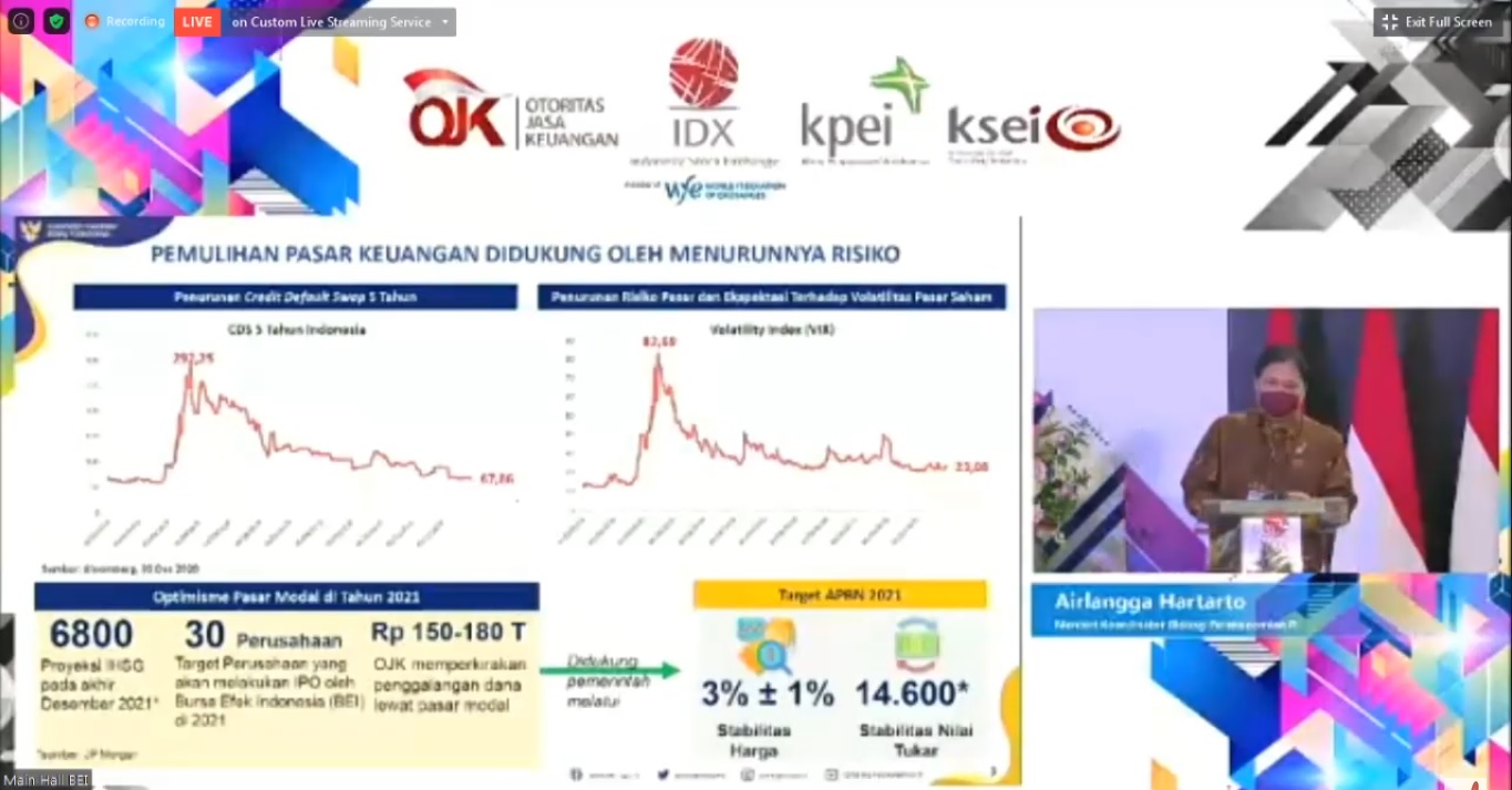 Menurut Airlangga, Indeks Harga Saham Gabungan (IHSG) diproyeksi bisa menyentuh 6.800 pada akhir tahun 2021. “Mengingat di 22 Desember 2020 sempat menyentuh 6.165,” katanya. Selain itu, Airlangga juga optimis BEI akan mencapai target 30 perusahaan yang melakukan Initial Public Offering (IPO) tahun ini.