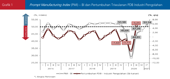 Pada triwulan I 2021, kinerja sektor Industri Pengolahan diprakirakan meningkat dan berada dalam fase ekspansi. PMI-BI pada triwulan I 2021 diprakirakan sebesar 51,14%, meningkat dari triwulan sebelumnya. Peningkatan PMI-BI didorong oleh komponen volume total pesanan, volume persediaan barang jadi, dan volume produksi yang berada pada fase ekspansi. Pada periode tersebut beberapa subsektor diprakirakan akan berada pada fase ekspansi, yaitu subsektor Makanan, Minuman dan Tembakau, subsektor Semen dan Barang Galian Non Logam, subsektor Pupuk, Kimia dan Barang dari Karet, dan subsektor Kertas dan Barang Cetakan.