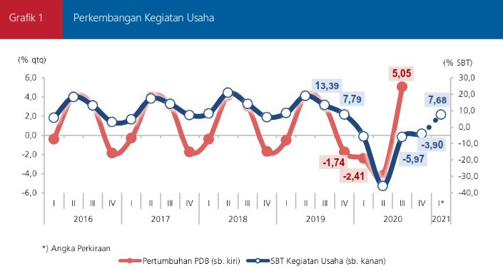 Pada triwulan I 2021, responden memprakirakan kegiatan usaha akan mencatat kinerja positif dengan SBT sebesar 7,68%. Berdasarkan sektor ekonomi, peningkatan diperkirakan terjadi pada seluruh sektor ekonomi, terutama sektor Keuangan, sektor Real Estate & Jasa Perusahaan, serta sektor Pertanian, Perkebunan, Peternakan, Kehutanan dan Perikanan.