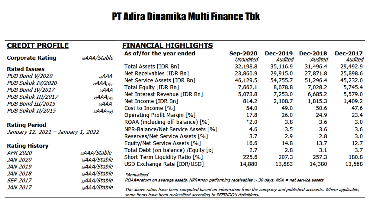 (Vibiznews – Bonds & Mutual) PEFINDO menegaskan peringkat kredit korporasi PT Adira Dinamika Multi Finance Tbk (Adira Finance) dan obligasi konvensional Adira Finance yang masih beredar di “idAAA”.PEFINDO juga menegaskan peringkat Sukuk Adira Finance yang masih beredar di “idAAA (sy)”. Prospek untuk peringkat kredit Perusahaan adalah “stabil”.