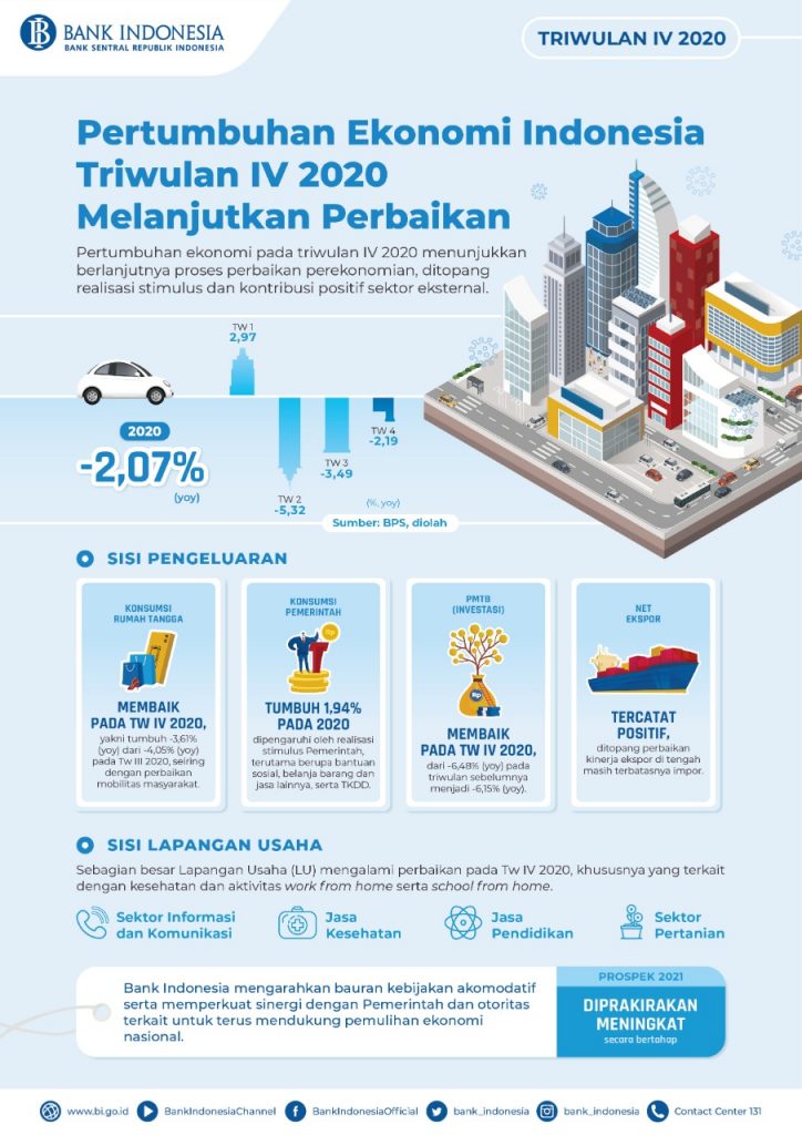 (Vibiznews – Economy) – Bank Indonesia menilai pertumbuhan ekonomi Indonesia pada triwulan IV 2020 menunjukkan berlanjutnya proses perbaikan perekonomian. Berdasarkan data Badan Pusat Statistik (BPS), meskipun mengalami kontraksi, pertumbuhan ekonomi pada triwulan IV 2020 sebesar -2,19% (yoy) membaik dari pertumbuhan triwulan III 2020 sebesar-3,49% (yoy). Tren perbaikan pada triwulan IV 2020 tersebut terjadi di hampir seluruh komponen permintaan dan lapangan usaha. Dengan perkembangan tersebut, pertumbuhan ekonomi Indonesia terkontraksi 2,07% pada tahun 2020.