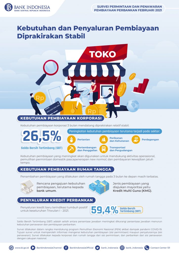 (Vibiznews – Banking) – Dalam Survei Permintaan dan Penawaran Pembiayaan Perbankan pada Februari 2021 terindikasi kebutuhan pembiayaan korporasi 3 bulan mendatang diprakirakan relatif stabil dibandingkan dengan survey pada bulan Januari 2021. Hal itu terlihat dari Saldo Bersih Tertimbang (SBT) sebesar 26,5%, relatif stabil dari SBT bulan sebelumnya sebesar 27,1%.