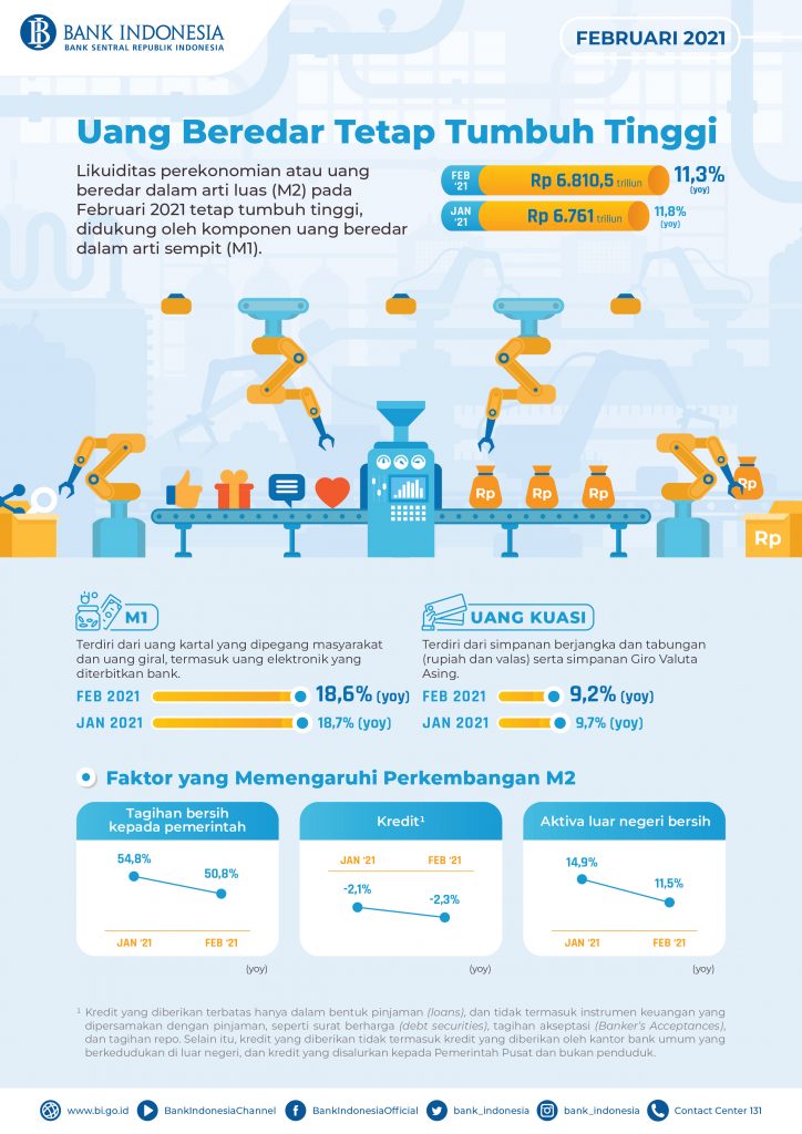 (Vibiznews – Banking and Economy) – Likuiditas perekonomian atau uang beredar dalam arti luas (M2) tetap tumbuh tinggi pada Februari 2021, didukung oleh komponen uang beredar dalam arti sempit (M1). Posisi M2 pada Februari 2021 sebesar Rp6.810,5 triliun atau tetap tumbuh tinggi sebesar 11,3% (yoy), meskipun melambat dibandingkan dengan pertumbuhan bulan sebelumnya sebesar 11,8% (yoy).