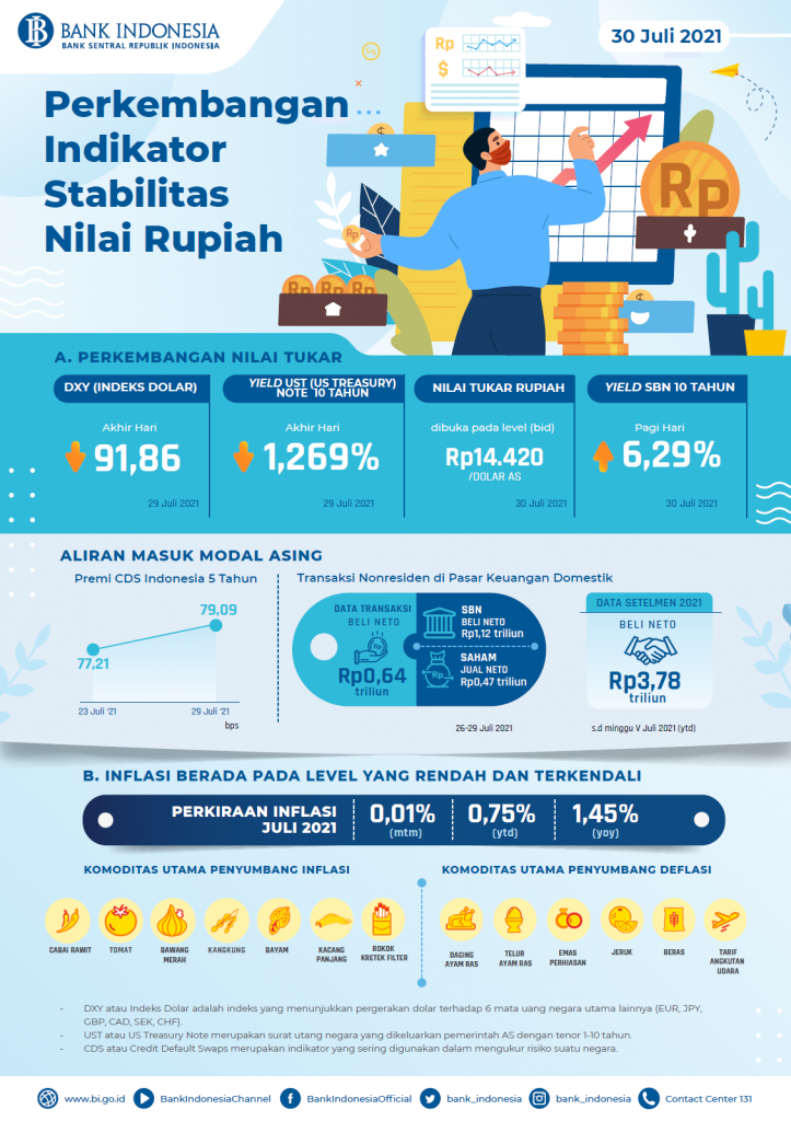 - Berdasarkan data transaksi 26-29 Juli 2021, nonresiden di pasar keuangan domestik beli neto Rp0,64 triliun terdiri dari beli neto di pasar SBN sebesar Rp1,12 triliun dan jual neto di pasar saham sebesar Rp0,47 triliun.