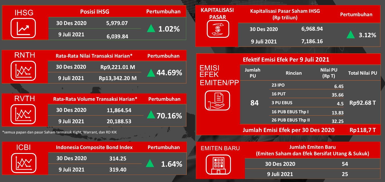 Total kapitalisasi pasar BEI juga naik 3,12% dari Rp 6.968,94 triliun pada 30 Desember 2020, mencapai Rp 7.186,16 triliun pada 9 Juli 2021. Nilai transaksi harian di Bursa Efek Indonesia pada 9 Juli 2021 naik 44,69% dari Rp 9.221,01 miliar, mencapai Rp 13.342,20. Year to date, ada 84 emisi baru, di antaranya 23 IPO senilai Rp 6,45 triliun. Ditambah rights issue, obligasi, dan sebagainya, raihan dananya Rp 92,68 triliun. Catatan OJK juga sudah terdapat 23-25 emiten baru IPO hingga 9 Juli dengan penawaran umum hingga Rp 6,45 triliun.