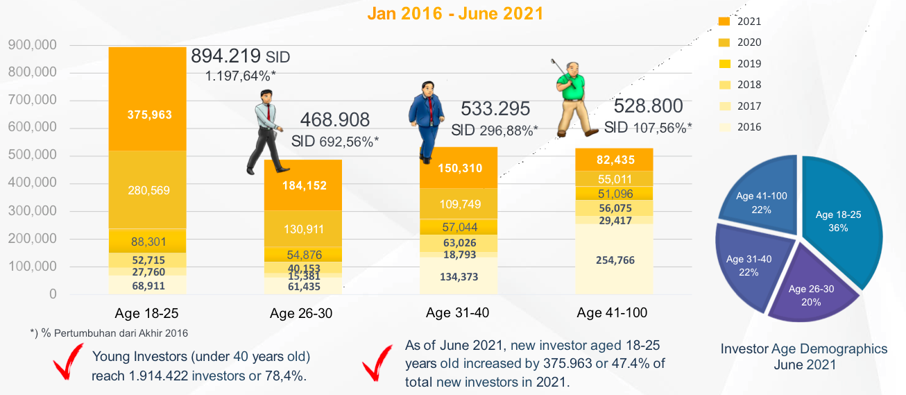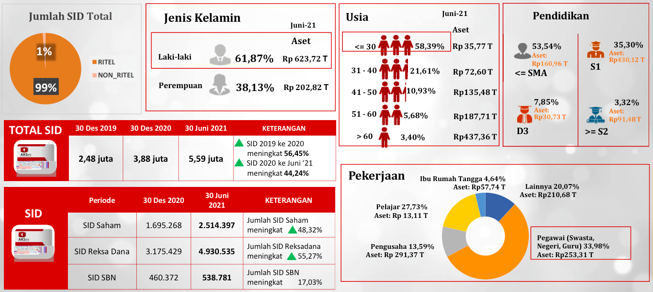 Hingga Juni 2021, jumlah investor meningkat pesat, mencapai 5,6 meningkat dari tahun 2020 yang jumlahnya 3,88 juta. Single Investor Identification (SID) 2019 ke 2020 meningkat 56,45%, SID 2020 ke Juni ‘21 meningkat 44,24%.
