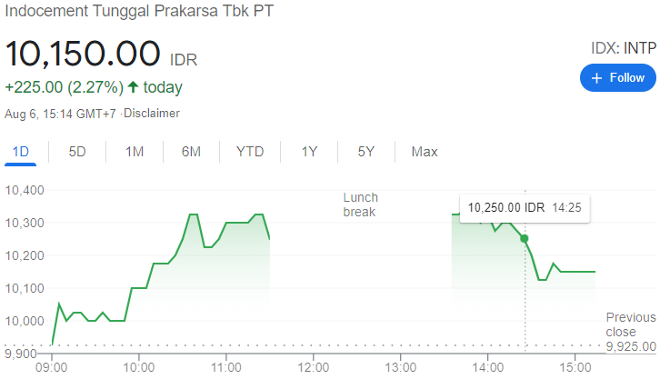 Pergerakan harga saham INTP, pada hari Jumat (6/8/2021) ditutup melonjak 2.27% atau 225 poin ke harga Rp.10150 per lembar, dari posisi terakhirnya di Rp.9925 per lembar. Nilai PER saham ini 31.85 dan nilai kapitalisasi pasar mencapai Rp.37.36 triliun.