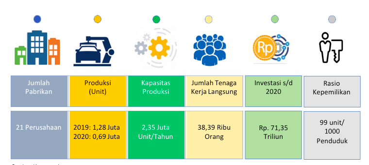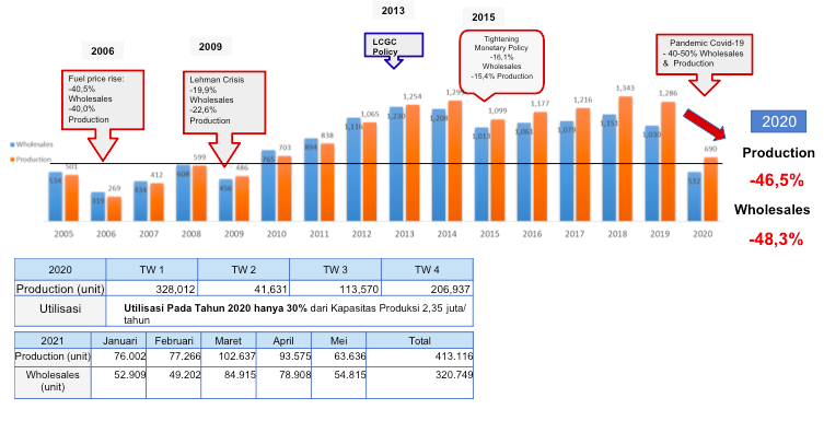 Pandemi Covid 19 mengakibatkan level produksi Indonesia hampir sama dengan produksi pada tahun 2008. Selain itu bila melihat dari trend selama 15 tahun terakhir, tahun 2020 adalah tahun terburuk dari segi penurunan dibanding tahun-tahun sebelumnya. Kinerja kendaraan roda empat atau lebih produksi tercatat sebesar 413.116 unit, wholesales tercatat sebesar 320.749 unit.