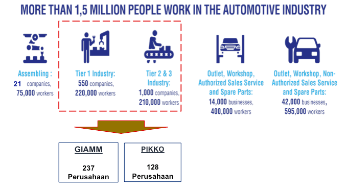 Industri otomotif Indonesia secara keseluruhan memiliki 1.5 juta karyawan. Assembling 21 perusahaan dengan 75.000 karyawan. Tier 1,2,3 1.500 perusahaan dengan karyawan 430 ribu, yang tergabung dalam gabungan industri alat mobil dan motor (GIAMM) sebanyak 237 perusahaan dan perkumpulan industri industri kecil komponen otomotif di indonesia (PIKKO) ada 128 perusahaan. Outlet, workshop, authorized sales service, and spare parts ada 14.000 bisnis dengan 400.000 karyawan. Outlet, workshop, non authorized sales service, and spare parts ada 42.000 bisnis dengan 595.000 karyawan.