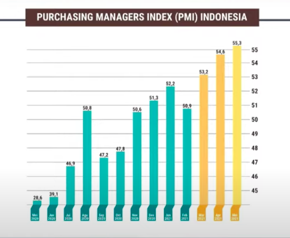 Purchasing managers index (PMI) Indonesia sejak Maret 2021 memberikan indikasi membaik. Angka PMI di bawah 50.0 menandakan sedang kontraksi sedangkan angka diatas 50.0 menandakan sedang ekspansif, karena melampaui ambang netral 50.0. Pada bulan Maret, PMI berada pada angka 53,2, kemudian meningkat menjadi 54,6 pada bulan April dan pada bulan Mei meningkat menjadi 55,3. Tiga bulan berturut-turut ini menunjukan rekor tertinggi dalam sejarah Indonesia. Indikator ini memberi sinyal bahwa ada pergerakan positif pada ekonomi Indonesia, khususnya industri manufaktur yang menyumbangkan 60 persen dari total ekspor Indonesia. Memang pada bulan Juni kemarin sedikit tertekan karena berlakunya PPKM darurat menjadi 53,5. Namun diperkirakan bisnis akan tetap menguat karena PMI masih di atas 50 poin sejak bulan Nov 2020 hingga Juni 2021, atau selama delapan bulan terakhir.