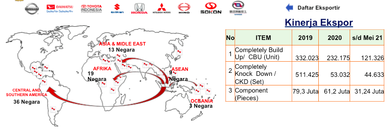 Ekspor untuk industri otomotif kendaraan roda empat atau lebih termasuk komponen pada periode Jan 2021 tercatat sebesar hampir Rp 30 trilliun dimana sebesar Rp 18,3 triliun merupakan ekspor kendaraan CBU (completely build up) dari Indonesia ke lebih dari 80 negara di dunia.