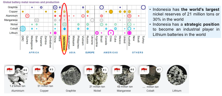 Indonesia memiliki cadangan nikel terbesar di dunia sebesar 21 juta ton atau 30% di dunia. Indonesia memiliki posisi strategis untuk menjadi pemain industri baterai Lithium di dunia.