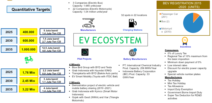 Indonesia menargetkan pada tahun 2030 akan memproduksi 600.000 EV roda empat yang akan menurunkan carbon sebesar 7,5 juta barel atau 2,7 juta ton. Memproduksi EV untuk roda dua yang akan menurunkan carbon sebesar 4 juta barel atau 1,4 juta ton.