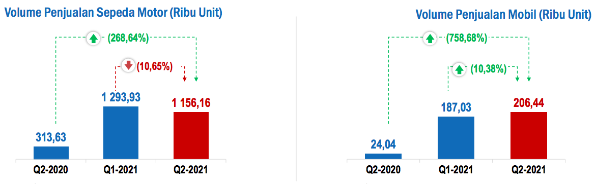 Triwulan 2-2021, perdagangan mobil, sepeda motor dan reparasinya tumbuh 37,88 persen akibat peningkatan penjualan mobil yang didorong oleh adanya program relaksasi PPnBM. Volume penjualan sepeda motor 1.156 ribu unit, meningkat 268,64% (yoy). Volume penjualan mobil 206,4 ribu unit, meningkat 758,68% (yoy).
