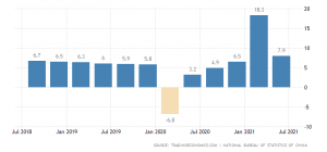 - Bursa saham Jepang dengan indeks Nikkei. Indeks Nikkei bulan Juli jatuh cukup signfikan dengan anjlok 5,5%, yang merupakan kinerja bulanan terburuk sejak krisis pasar yang disebabkan oleh virus corona pada Maret tahun lalu. Pekan lalu Nikkei alami pelemahan mingguan pertama dalam 3 pekan hingga anjlok 3,4%. Untuk bulan Agustus ini diperkirakan akan kembali alami kerugian namun lebih moderat, dimana hingga pekan ketiga bulan Agustus posisi Nikkei sudah melemah 1,77%.