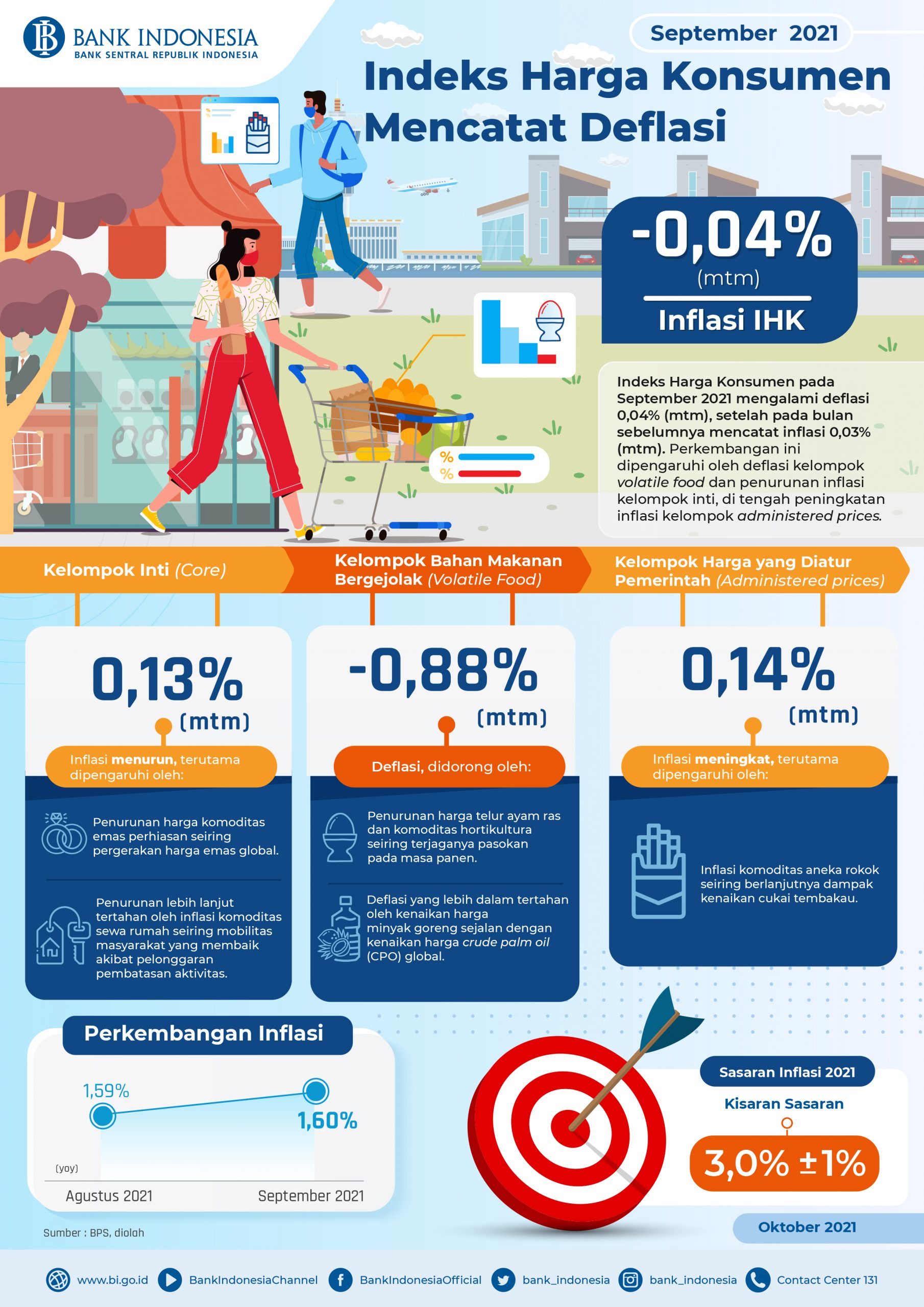 (Vibiznews – Economy & Business) – Berdasarkan data Badan Pusat Statistik (BPS), Indeks Harga Konsumen (IHK) pada September 2021 mengalami deflasi 0,04% (mtm), setelah pada bulan sebelumnya mencatat inflasi 0,03% (mtm). Perkembangan ini dipengaruhi oleh deflasi kelompok volatile food dan penurunan inflasi kelompok inti, di tengah peningkatan inflasi kelompok administered prices. Secara tahunan, inflasi IHK September 2021 tercatat 1,60% (yoy), sedikit lebih tinggi dibandingkan dengan inflasi bulan sebelumnya sebesar 1,59% (yoy).