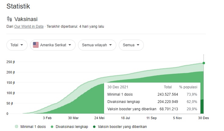 Berdasarkan data statistic dari Our World in Data, maka tingkat orang Amerika yang diberikan vaksin terus meningkat. Sampai dengan akhir tahun 2021, maka tingkat orang Amerika yang sudah divaksin lengkap sebanyak 62%. Peningkatan vaksinasi ini memberikan optimisme ekonomi AS, dimana kegiatan-kegiatan ekonomi sudah lebih banyak dibuka dan memberikan dukungan bagi penguatan ekonomi AS. Hal ini mmeberikan sentiment positif bagi pergerakan bursa saham AS.