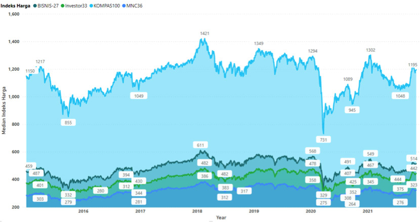 Indeks composite merupakan Indeks Harga Saham Gabungan (IHSG) dari seluruh perusahaan yang masuk ke bursa saham. Indeks Komposite dapat digunakan untuk mengukur kinerja saham Pasar Modal Indonesia. Pada gambar 1 ditunjukkan dalam rentang periode waktu 2015-2021 terjadi dua kali penurunan tajam harga saham pada tahun 2015 dan tahun 2020. Sentimen negatif baik dari dalam maupun luar negeri mempengaruhi penurunan harga saham Indonesia pada tahun 2015.