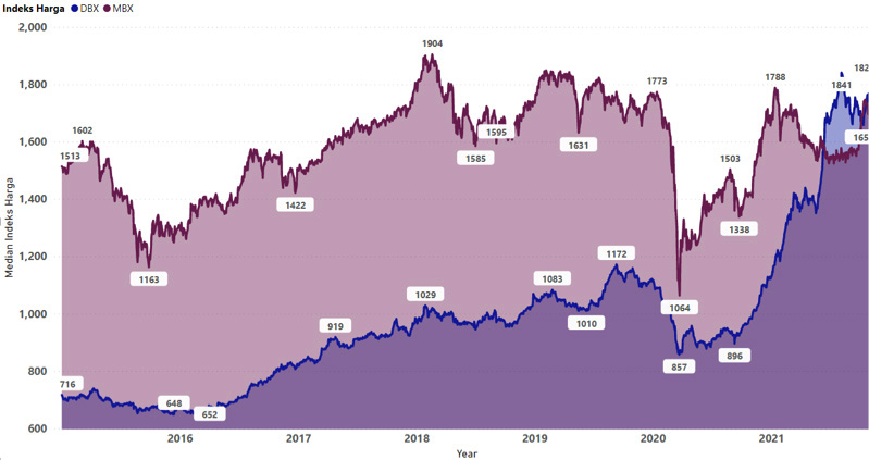 Indeks Papan Utama (MBX) dan Indeks Papan Pengembangan Bursa Efek Indonesia 2015-2021