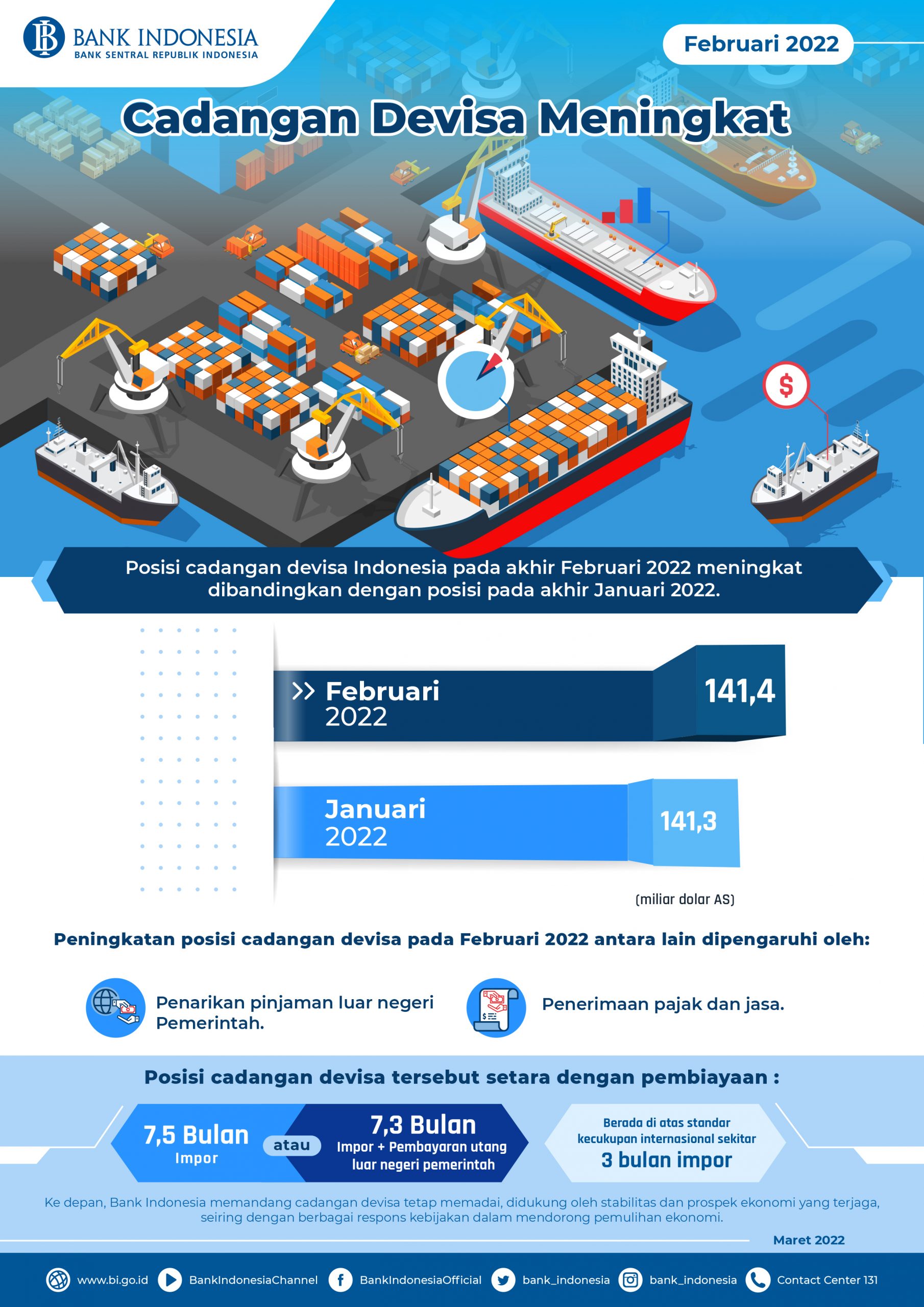 (Vibiznews – Banking & Insurance) – Bank Indonesia merilis datang cadangan devisa pada akhir Februari 2022. Adapun posisi cadangan devisa Indonesia pada akhir Februari 2022 tercatat sebesar 141,4 miliar dolar AS, meningkat dibandingkan dengan posisi pada akhir Januari 2022 sebesar 141,3 miliar dolar AS. Peningkatan posisi cadangan devisa pada Februari 2022 antara lain dipengaruhi oleh penarikan pinjaman luar negeri Pemerintah serta penerimaan pajak dan jasa.