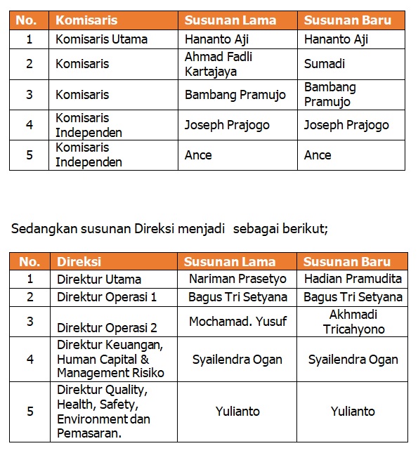 Adapun Perubahan Pengurus Perseroan dan/atau Perubahan Nomenklatur Jabatan. Untuk Dewan Komisaris diputuskan memberhentikan dengan hormat Ahmad Fadli Kartajaya selaku Komisaris. Kemudian mengangkat Bapak Sumadi sebagai Komisaris. sedangkan untuk Jajaran Direksi diputuskan memberhentikan dengan hormat Bapak Nariman Prasetyo sebagai Direktur Utama dan Mochamad Yusuf sebagai Direktur Operasi 2. Kemudian mengangkat Bapak Hadian Pramudita sebagai Direktur Utama dan mengangkat Akhmadi Tricahyono sebagai Direktur Operasi 2.