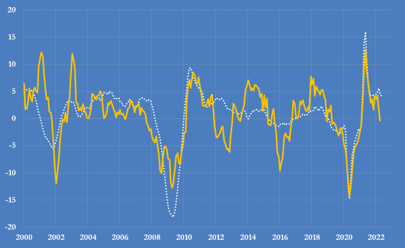 Pertumbuhan output tiga bulan adalah yang terlemah sejak awal 2021, dan menegaskan momentum perlambatan yang terlihat pada data lain tentang output, pesanan, dan pekerjaan (“Produksi industri dan pemanfaatan kapasitas”, Federal Reserve, 15 Juli).