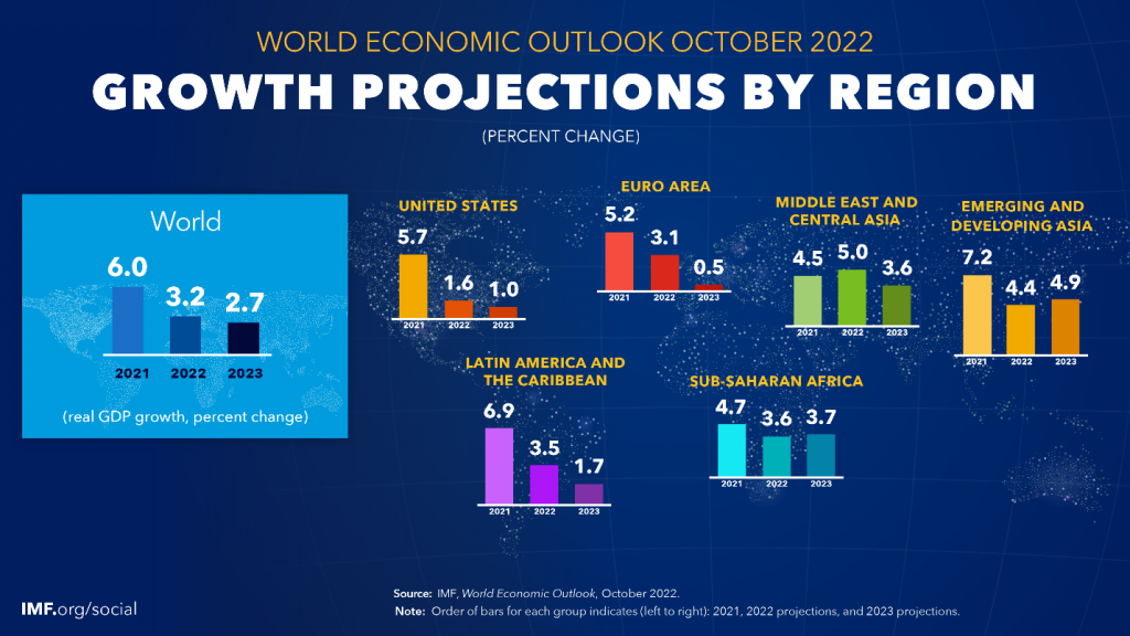IMF menyatakan kegiatan ekonomi global mengalami perlambatan yang luas dan lebih tajam dari perkiraan, dengan inflasi yang lebih tinggi dari yang terlihat dalam beberapa dekade. Krisis biaya hidup, pengetatan kondisi keuangan di sebagian besar wilayah, invasi Rusia ke Ukraina, dan pandemi COVID-19 yang berkepanjangan, semuanya sangat membebani prospek. Pertumbuhan global diperkirakan melambat dari 6,0 persen pada 2021 menjadi 3,2 persen pada 2022. Ini merupakan profil pertumbuhan terlemah sejak 2001.