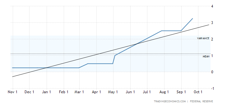 Federal Reserve AS telah menaikkan suku bunga acuannya sebesar 300 basis poin (bps) hingga bulan Oktober 2022, dan diperkirakan akan menaikkan suku bunga lagi bulan November 2022.