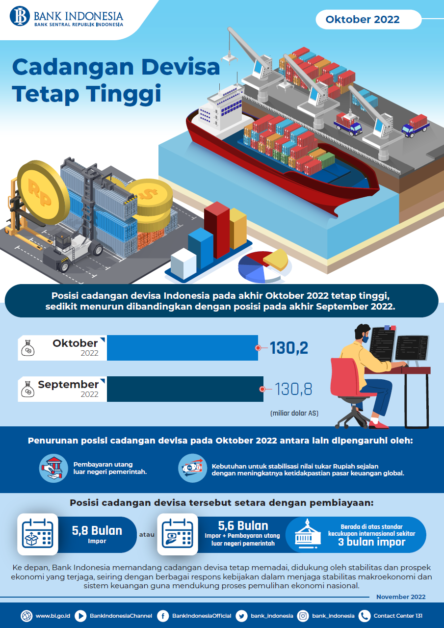 (Vibiznews – Economy & Business) – Bank Indonesia merilis posisi cadangan devisa Indonesia akhir Oktober 2022 di mana nilainya tetap tinggi sebesar 130,2 miliar dolar AS. Meski sedikit menurun dibandingkan dengan posisi pada akhir September 2022 sebesar 130,8 miliar dolar AS.