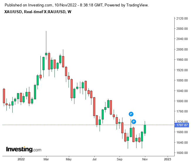 Memulai tahun yang baru 2022 pada awal bulan Januari, harga emas berada pada level $1,829. Harga emas melonjak tinggi pada bulan Maret dan mencapai rekor $2,061 yang menyamai rekor pada bulan Agustus 2020 karena meningkatnya ketegangan geopolitik akibat Rusia menyerbu Ukraina. Namun sekarang harga emas harus berjuang bertahan di level $1,657.