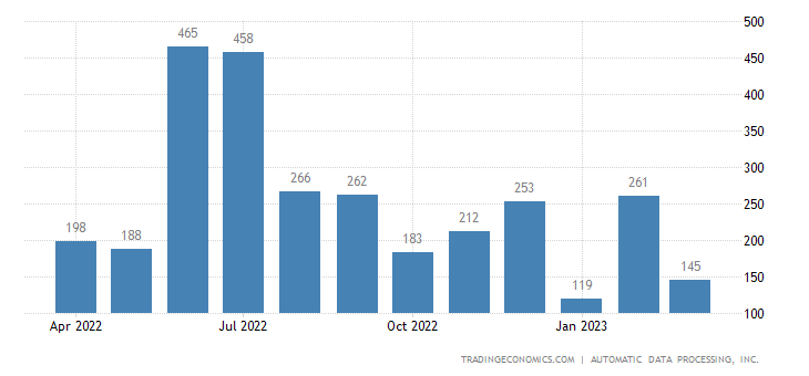 (Vibiznews – Economy & Business) Perusahaan swasta di AS menciptakan 145 ribu pekerjaan pada Maret 2023, di bawah 261 ribu yang direvisi naik pada Februari dan perkiraan 200 ribu, sebagai tanda pasar tenaga kerja melambat karena permintaan konsumen surut dan biaya pinjaman naik.