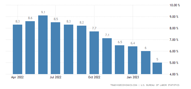 Tingkat inflasi tahunan di AS melambat untuk periode kesembilan berturut-turut menjadi 5% pada Maret 2023, terendah sejak Mei 2021 dari 6% pada Februari, dan di bawah perkiraan pasar 5,2%.