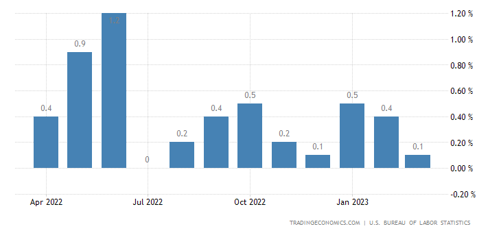 Secara bulanan, Inflasi di AS meningkat 0,1 persen bulan ke bulan di bulan Maret 2023, melambat dari kenaikan 0,4 persen di bulan Februari dan di bawah ekspektasi analis kenaikan 0,2 persen.