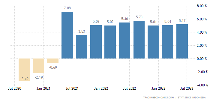 (Vibiznews – Economy & Business) Pertumbuhan Ekonomi Indonesia meningkat sebesar 5,17% secara tahunan di Q2 tahun 2023, lebih cepat dari perkiraan pasar sebesar 4,93%, dan setelah pertumbuhan 5,04% yang sedikit direvisi di Q1.