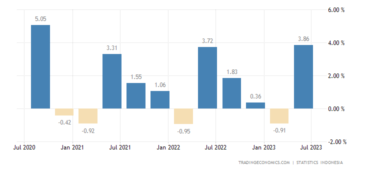 Secara triwulanan, perekonomian Indonesia tumbuh 3,86% qoq di Triwulan ke-2 tahun 2023, di atas konsensus pasar sebesar 3,72%, berbalik dari penurunan tipis sebesar 0,91% di Triwulan ke-1 sementara menunjukkan pertumbuhan triwulanan tertajam sejak Triwulan ke-3 tahun 2020.
