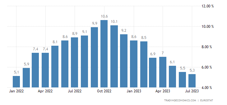 (Vibiznews – Economy & Business) Tingkat inflasi harga konsumen di Kawasan Euro turun sesuai perkiraan sebesar 5,3% pada Juli 2023, terendah sejak Januari 2022 terutama karena penurunan harga energi lebih lanjut (-6,1% vs -5,6%).
