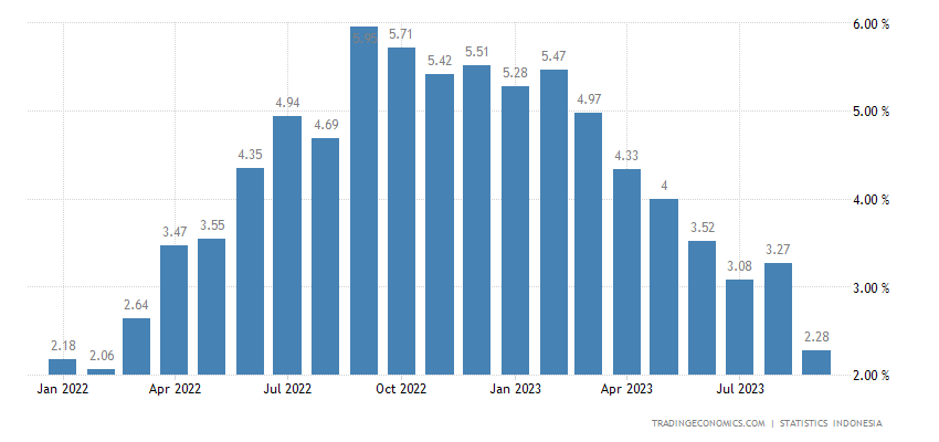 (Vibiznews – Economy & Business) Tingkat inflasi tahunan Indonesia turun menjadi 2,28% pada September 2023 dari 3,27% pada bulan sebelumnya, dibandingkan dengan perkiraan pasar yang memperkirakan kenaikan sebesar 2,2%.