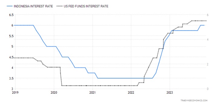 Sementara itu, Bank Indonesia juga telah menaikkan suku bunga acuan BI7DRR sebanyak enam kali (6 X), dari level 3,5% dinaikkan bertahap pada Agustus 2022, dan mencapai level 6,0% pada Oktober 2023.