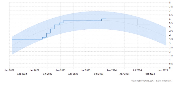 Grafik di atas merupakan gambaran proyeksi penurunan suku bunga acuan Bank Indonesia BI7DRR. Dari level 6% di akhir tahun 2023 menjadi sekitar 4% di awal 2025. Angka ini mungkin cukup agresif, namun istilah “sekitar” di sini menunjukkan suatu perkiraan umum, karena pada akhirnya keputusan suku bunga berada di tangan Rapat Dewan Gubernur Bank Indonesia yang memutuskannya dengan sejumlah pertimbangan yang matang.