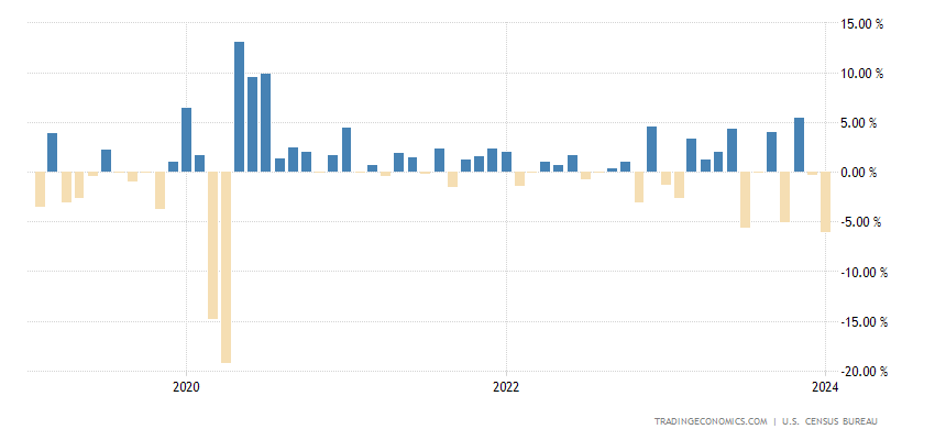 (Vibiznews – Economy & Business) Pesanan baru untuk barang tahan lama manufaktur di Amerika Serikat merosot sebesar 6,1% bulan ke bulan pada bulan Januari 2024, lebih besar dari ekspektasi pasar yang memperkirakan penurunan sebesar 4,5% dan menyusul penurunan sebesar 0,3% pada bulan Desember.