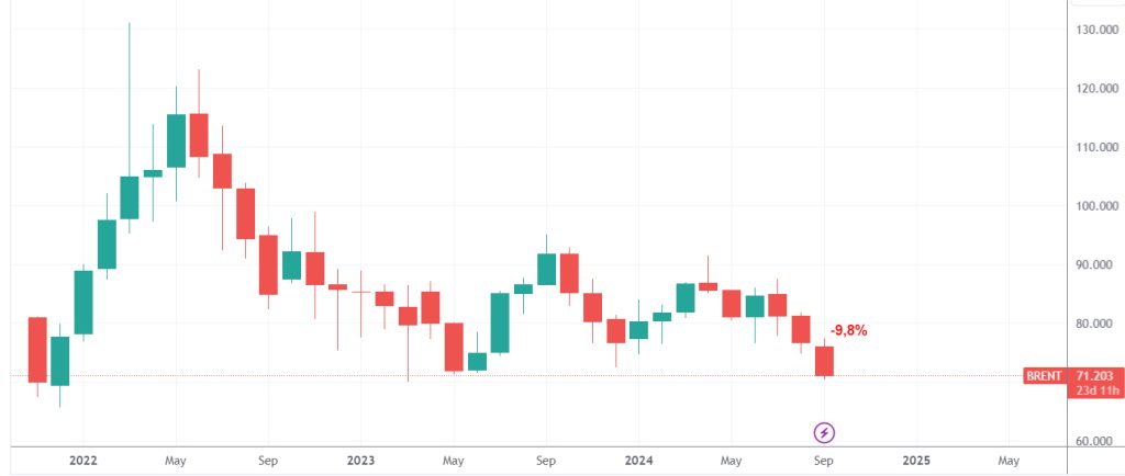 Harga minyak acuan dunia atau Brent Crude anjlok ke harga terendah sejak Desember 2021 pada perdagangan yang berakhir Sabtu dinihari (7/9/2024) di $71,06 per barel, dan secara mingguan anjlok 9,8%.